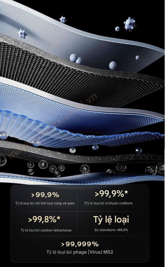 Lọc sâu đến 0.0001 micron, loại bỏ >99,999% virus, vi khuẩn, kim loại nặng, clo và tạp chất – đảm bảo an toàn tuyệt đối cho mẹ và bé.