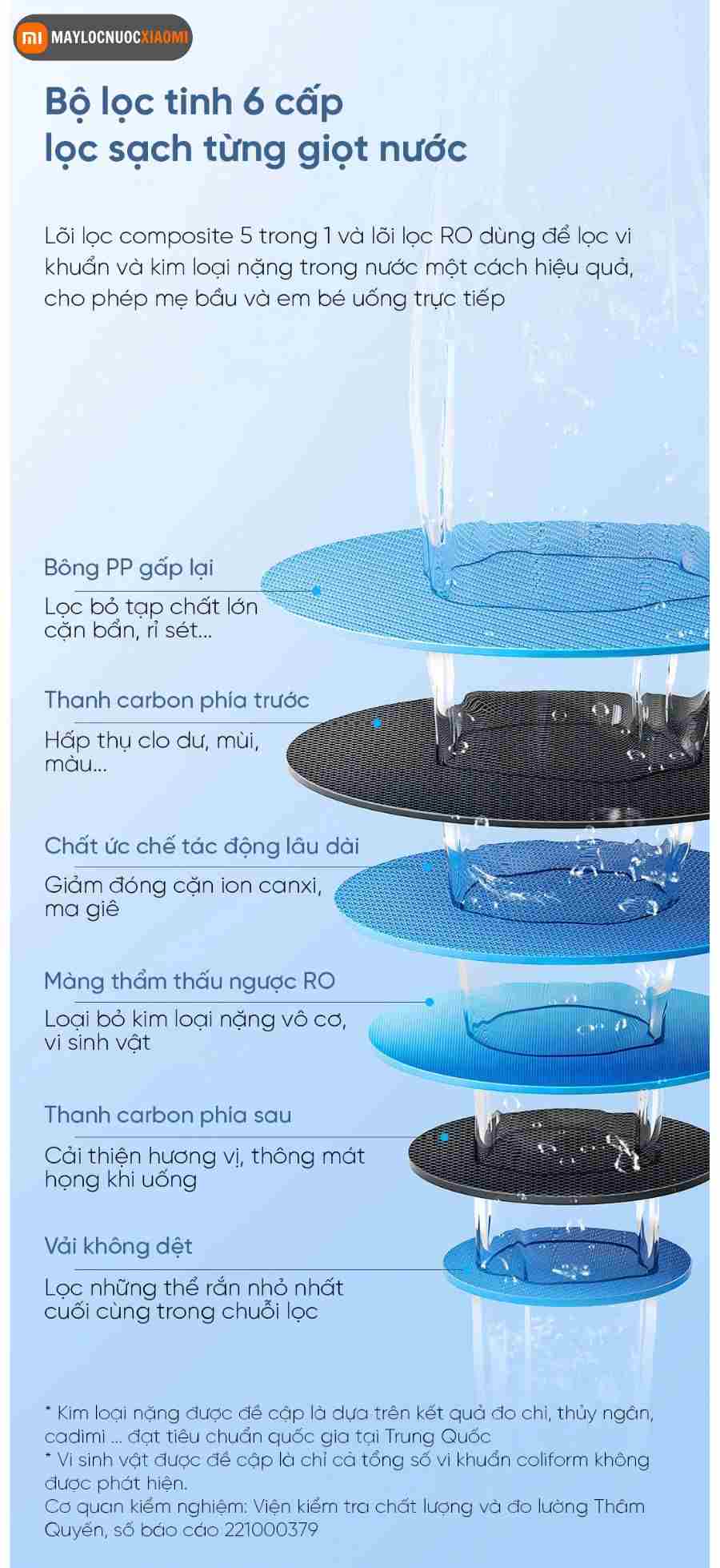 Màng RO của Xiaomi thường có kích thước lỗ lọc siêu nhỏ (khoảng 0.0001 micromet), chỉ cho phép các phân tử nước tinh khiết đi qua. Điều này đảm bảo nước sau khi lọc an toàn tuyệt đối để uống trực tiếp mà không cần đun sôi.