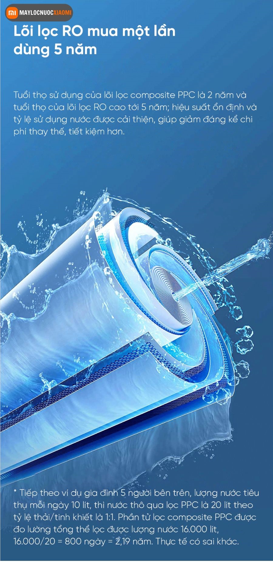 Máy lọc nước Xiaomi tích hợp hệ thống tự động rửa ngược thông minh, làm sạch lõi lọc định kỳ mà không cần can thiệp thủ công. Nhờ công nghệ này, tuổi thọ của lõi lọc RO có thể kéo dài lên đến 5 năm và 2 năm với lõi lọc PPC, vượt trội so với các máy lọc nước thông thường chỉ khoảng 16-12 tháng. Điều này không chỉ giúp giảm chi phí thay lõi mà còn duy trì hiệu suất lọc nước ổn định, mang lại sự yên tâm tuyệt đối cho người dùng.
